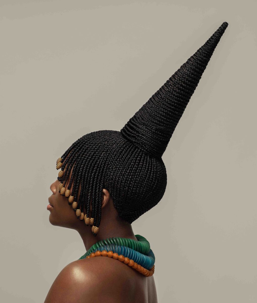 Many of the historic and contemporary hairstyles that Zizipho references include architectural constructions where the hair (or artificial extensions in many cases) is wrapped over armatures. These include the complex crested arrangement worn by Fulani women from West Africa and the fan-shaped headpiece of the Zande from Congo.