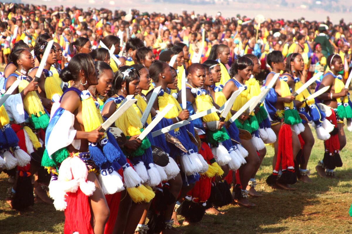 (Above) Young girls dance before Swaziland’s King Mswati III (not in the picture) during the traditional “Umhlanga” ceremony known as the Reed Dance at which, girls from across Swaziland (some as young as ten) make a pilgrimage into the surrounding hills where they cut reeds they will present to the royal kraal. Some believe the king will choose them as his next bride, when they eventually dance before him bare-breasted and in full, traditional regalia during the final ceremony. AFP PHOTO / Jinty Jackson